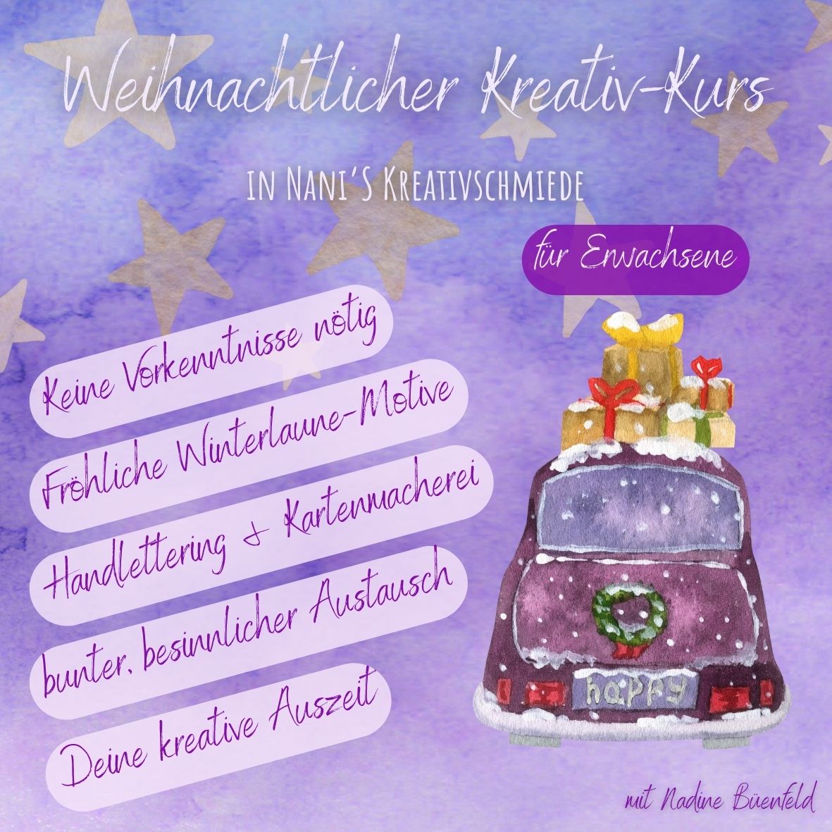 Wohlmöglich in schnellen Schritten, denn diese Zeit ist oft rasant. Um ein bisschen Ruhe und Flow zu genießen darfst du dich zu deiner weihnachtlichen, kreativen Auszeit in Nani’s Kreativschmiede eingeladen fühlen.