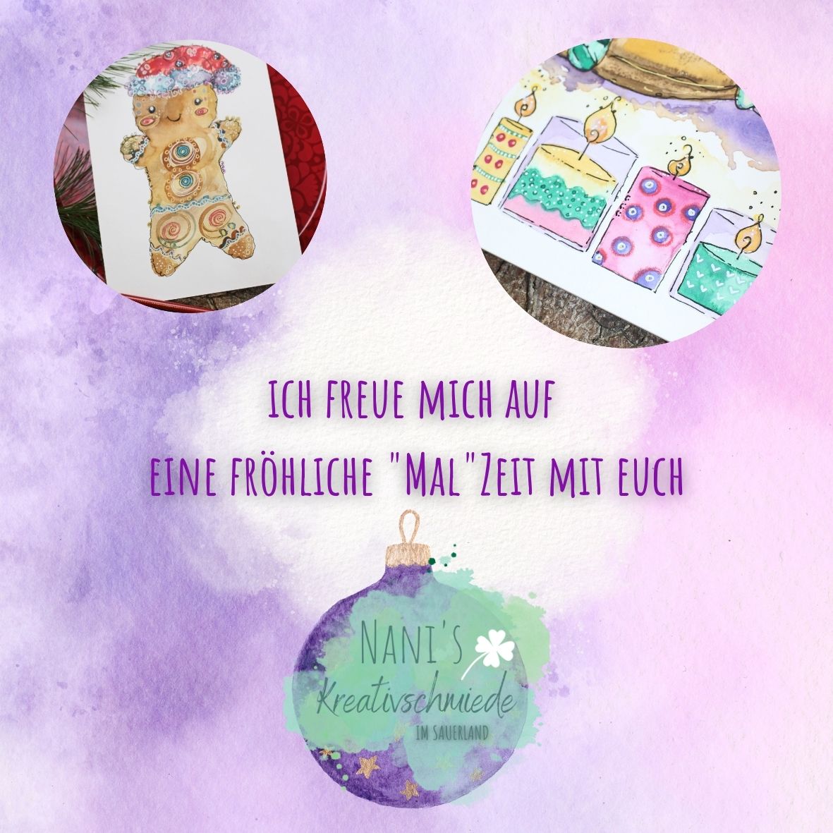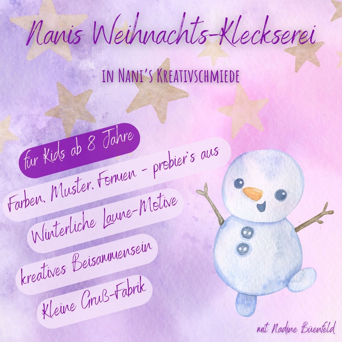 „In der Weihnachts-Kleckserei“ – wir gestalten für die kommende Adventszeit und lassen weihnachtliche Vorfreude aufkommen. Du bist herzlich eingeladen das vergnügte Kunst-Treiben mitzugestalten.