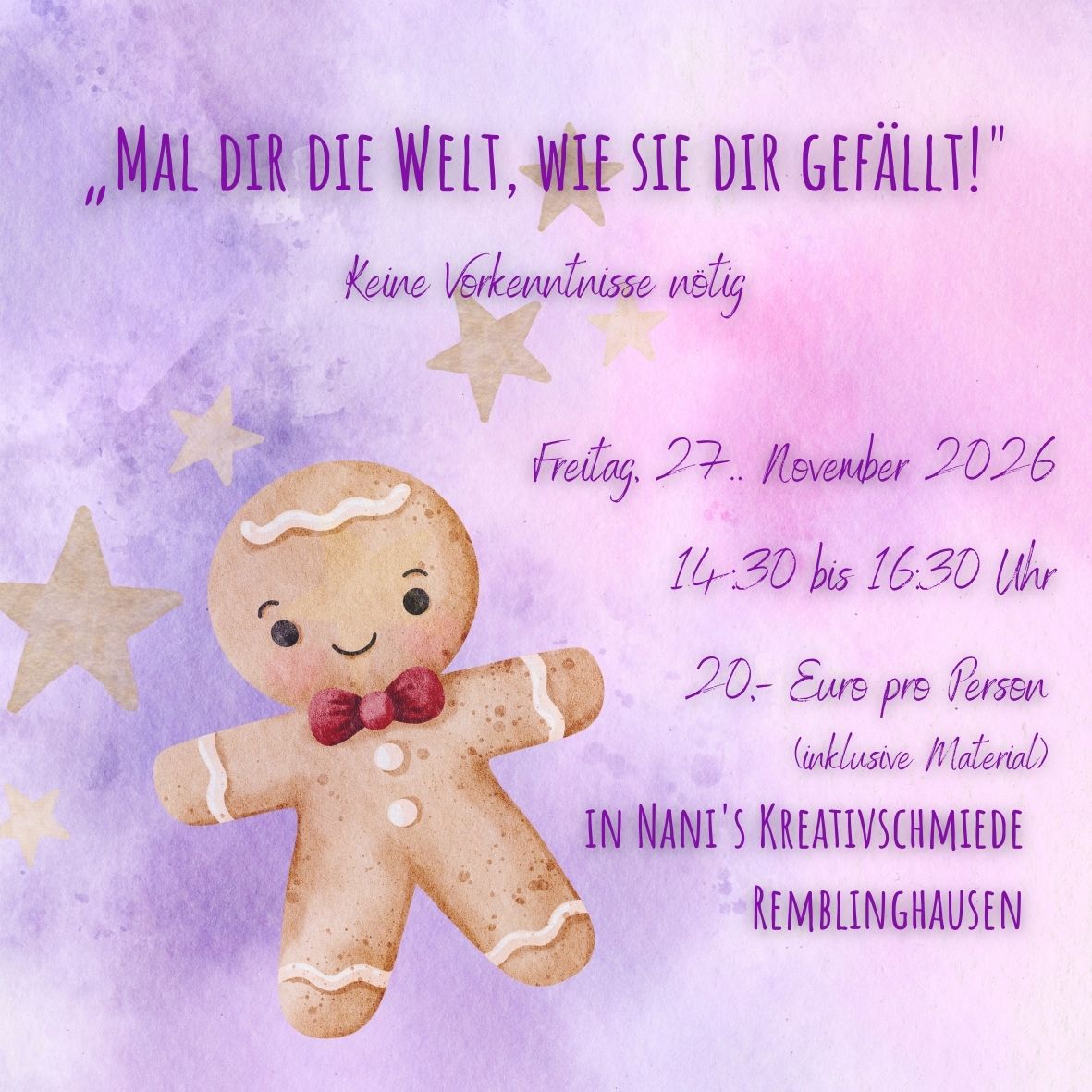 Kids ab 8 Jahren erleben einen besinnlich-bunten, gemütlichen und fantasievollen Nachmittag. Mit lockerleichten spannenden Mal-Möglichkeiten und „wichteligen“ Motiven gestalten wir nach Herzenslust für unsere Wichtelfreunde und dürfen zum Schluss noch einer liebevollen Geschichte lauschen.