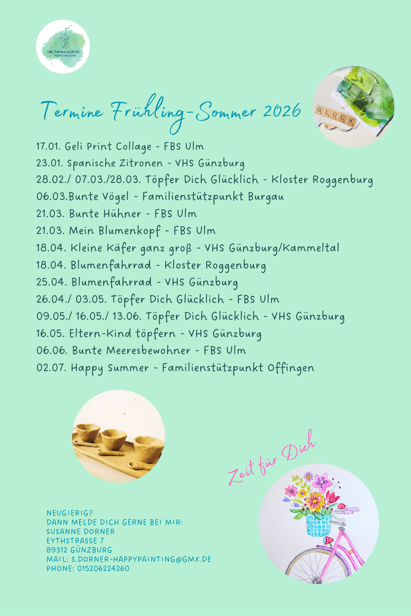 Hier findest Du meine aktuellen Kurse für das Frühjahr und den Sommer 2026. Melde Dich gerne bei mir bei Interesse an einem meiner Kurse. Ich schicke Dir gerne die Anmelde-Adresse.