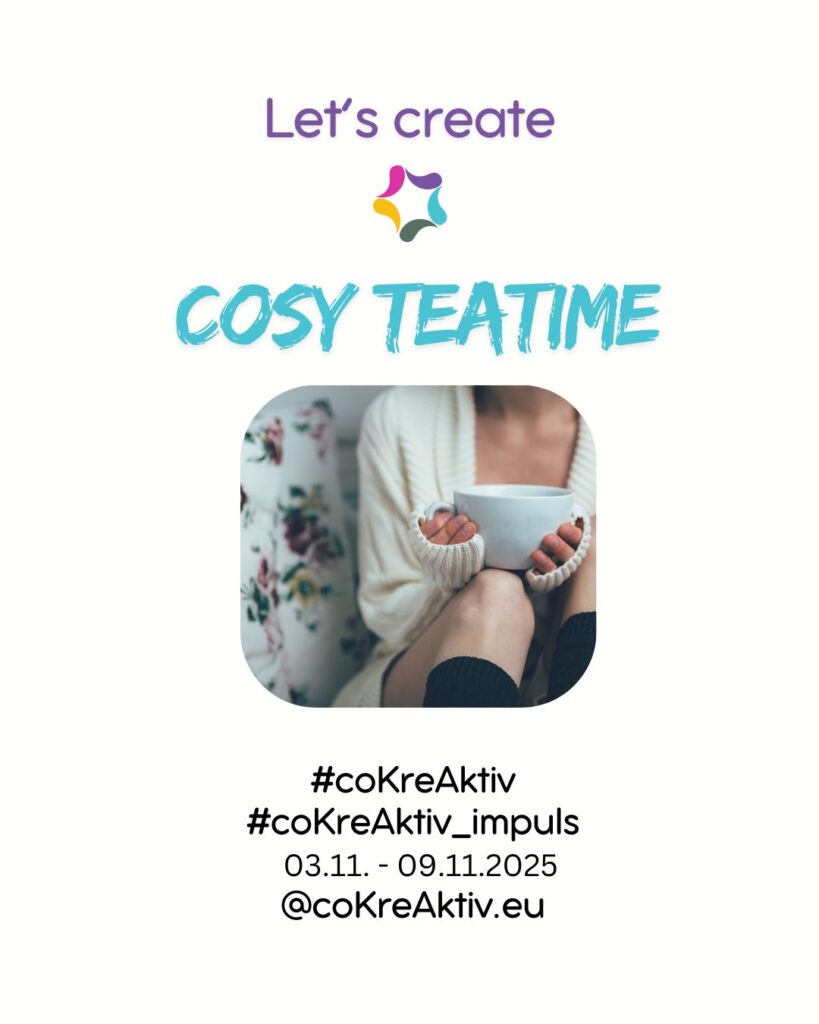 Teile deinen kreativen und gemütlichen Beitrag mit #coKreAktiv oder #coKreAktivmpuls bis Sonntag, 09.11.2025 auf Social Media oder cokreaktiv.com.